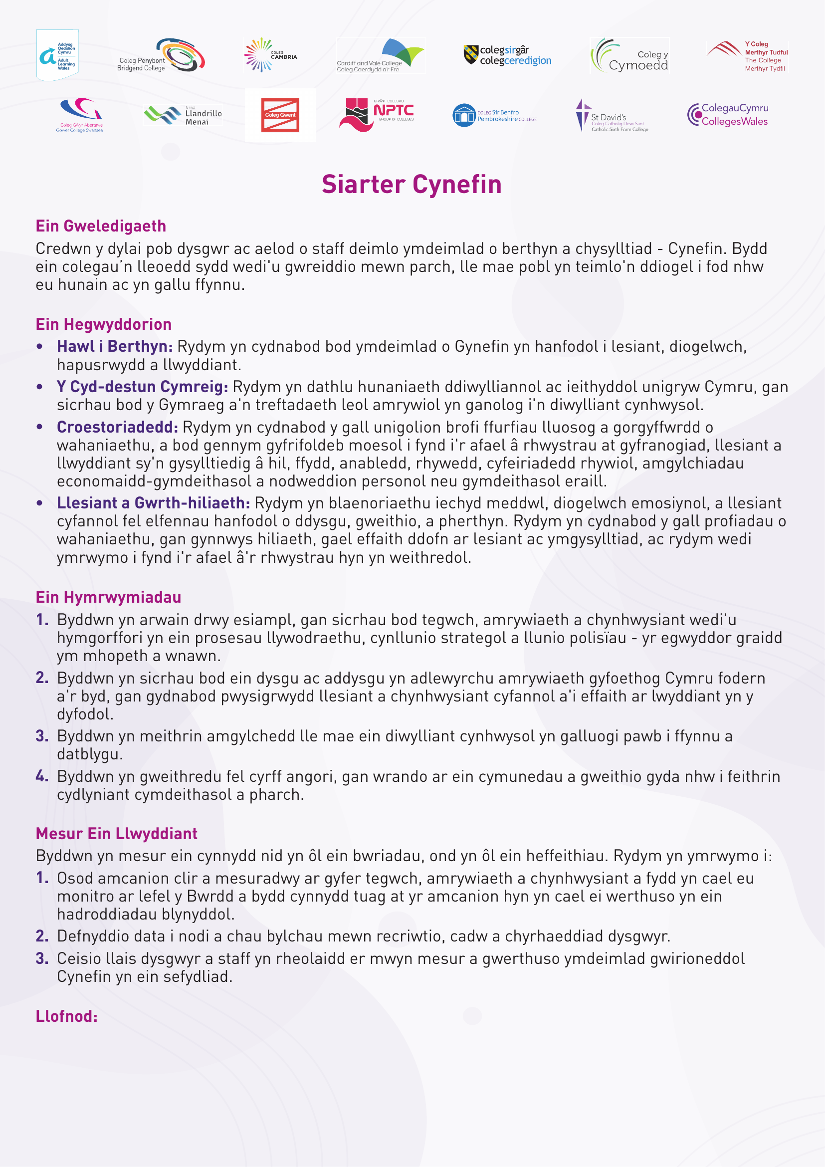 Drwy’r Siarter, mae colegau’n ymrwymo i: