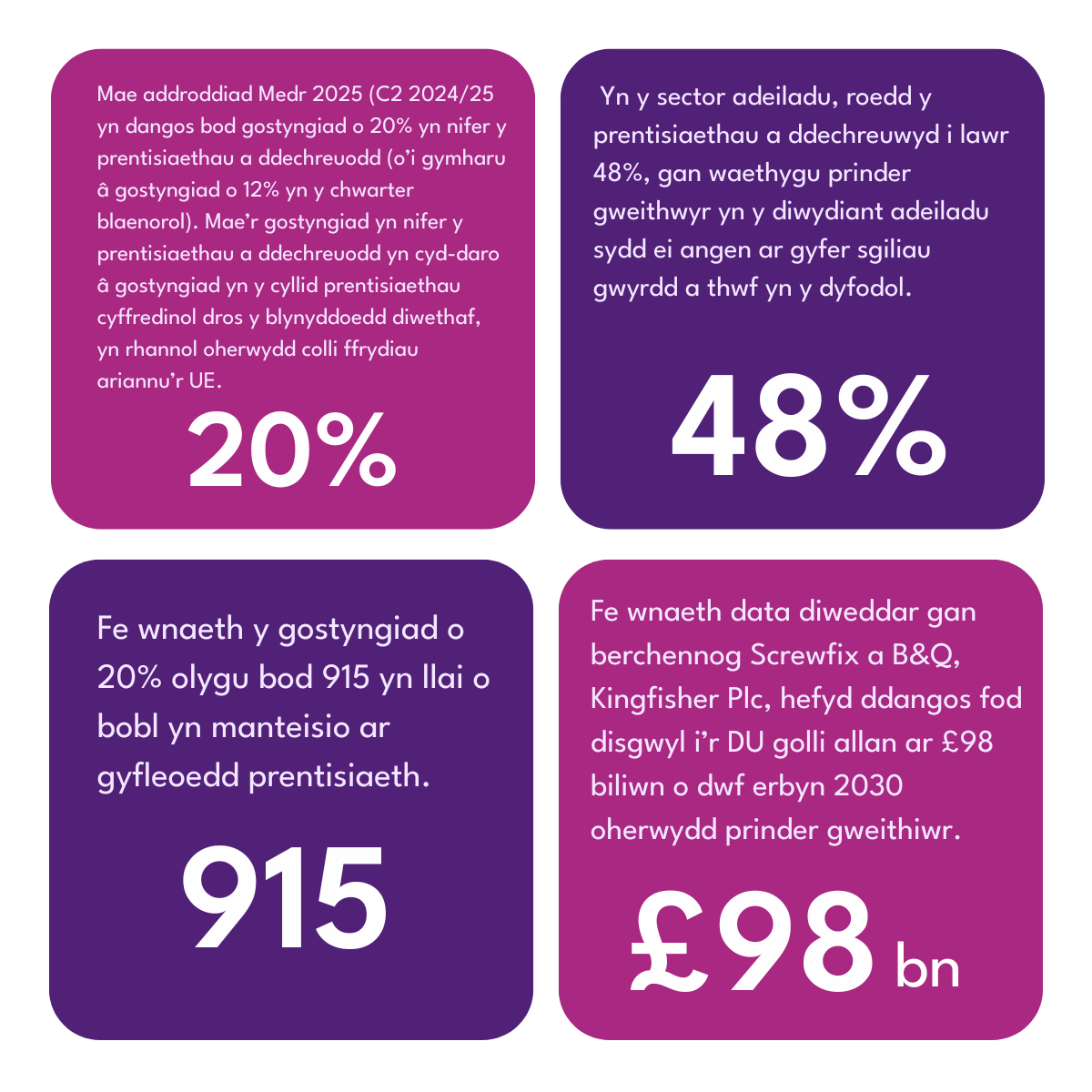- Ail-ymrwymo i Raglen Brentisiaethau newydd i gynnal y momentwm a gyflawnwyd dros ddau dymor diwethaf y Senedd. Dylai llywodraeth nesaf Cymru wrthdroi’r toriadau i’r Rhaglen Brentisiaethau ac ail-ymrwymo i ddarparu o leiaf 125,000 o brentisiaethau o safon ac i bob oedran dros dymor nesaf y Senedd. Mae angen i ni ddatblygu’r genhedlaeth nesaf o swyddi yn y sector preifat a helpu i ailadeiladu gwasanaethau cyhoeddus allweddol.